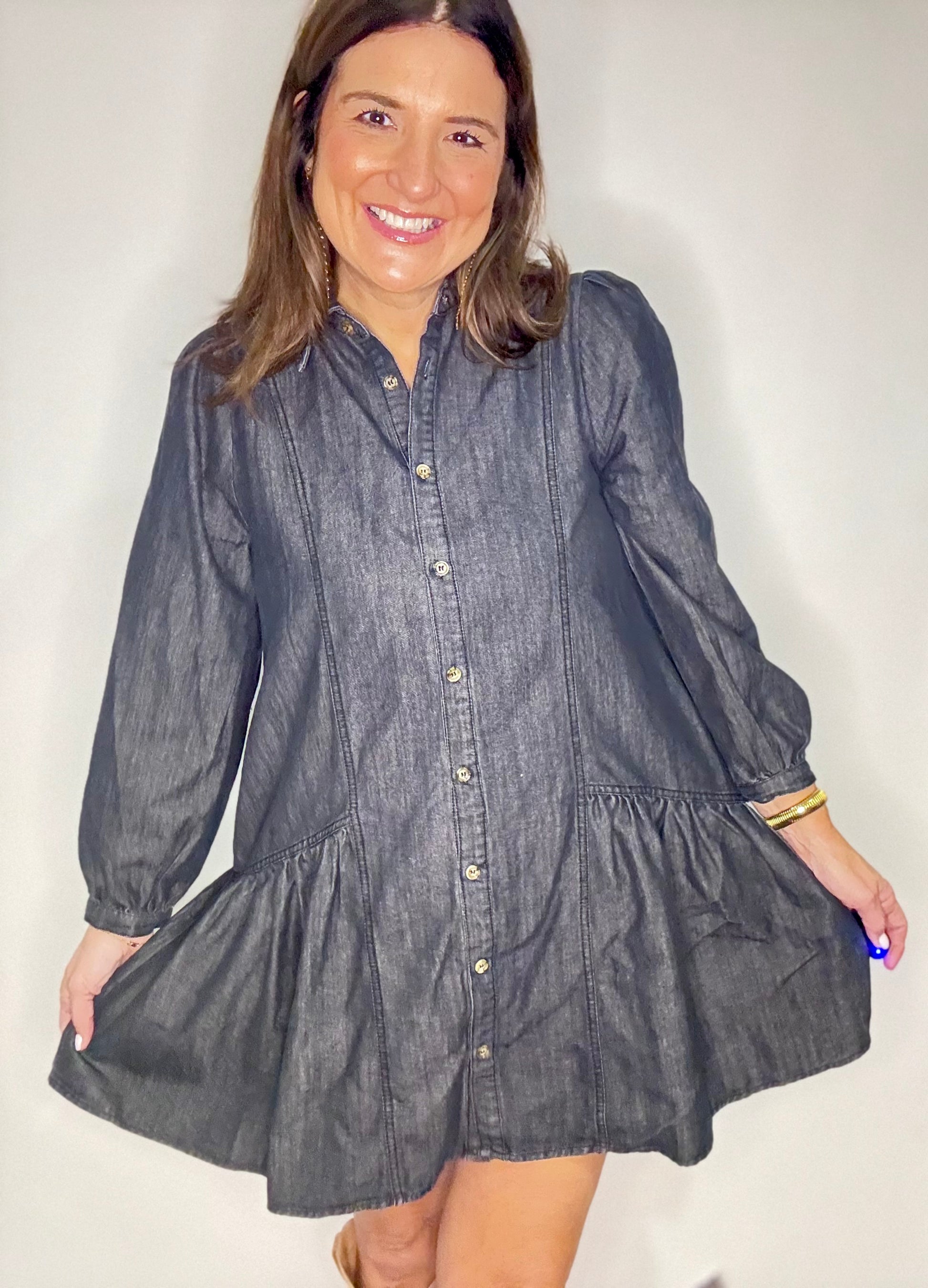 Black Denim Dres, light weight, buttons up the front, collar. Ruffle bottom. & long sleeved
