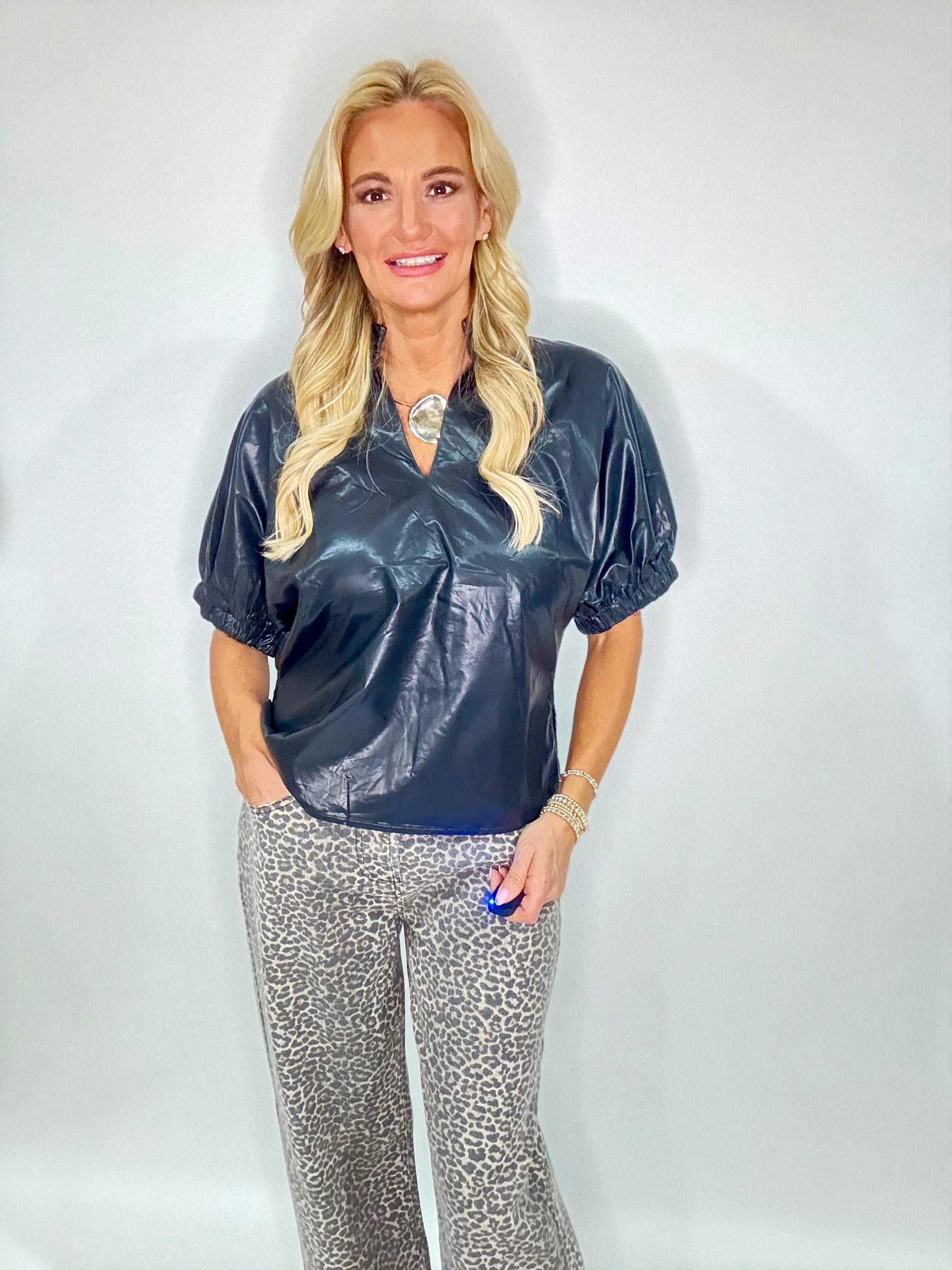 Black Leather Inspired puff sleeve top. Lined.