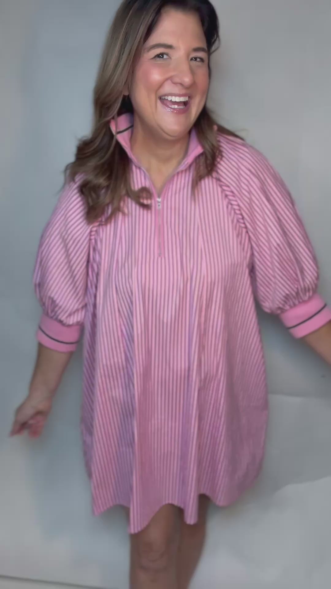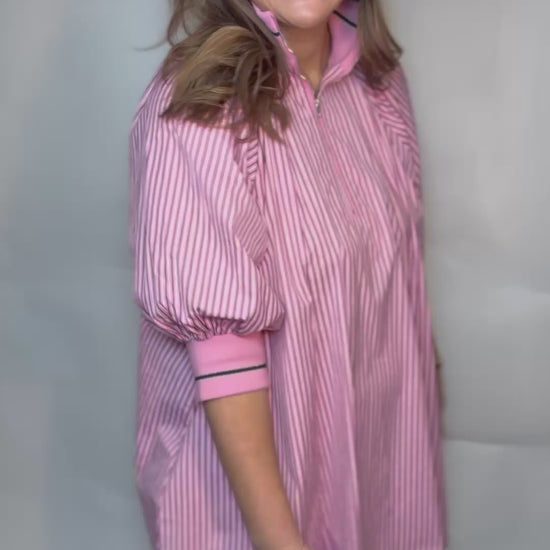 Introducing the Pink Stripe Zip Top Dress - a versatile piece with stretchy sleeves and a high collar with gold trim that zips at the neck. Made with blue stripe fabric, this dress is perfect for dressing up or down. Stay stylish and comfortable in this playful and quirky top.
