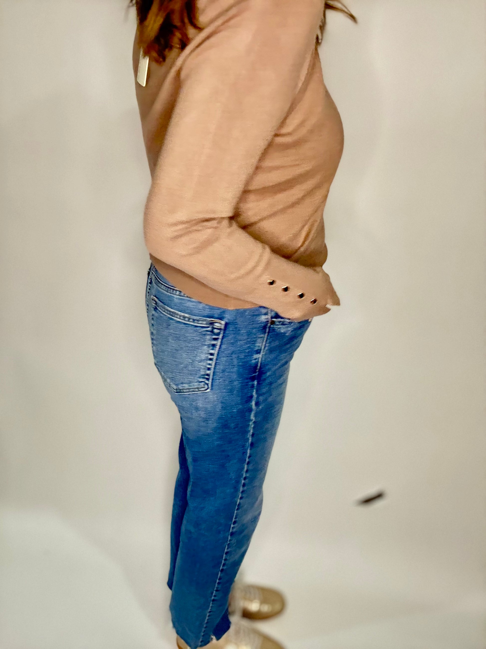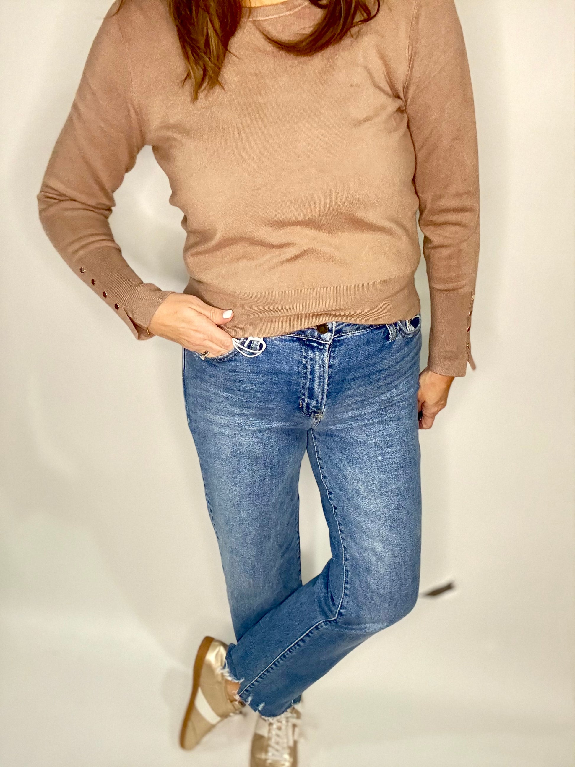 Just Black Denim Straight High waisted jeans. Straight fit, stretch, frayed bottom, ankle length . Med colored .