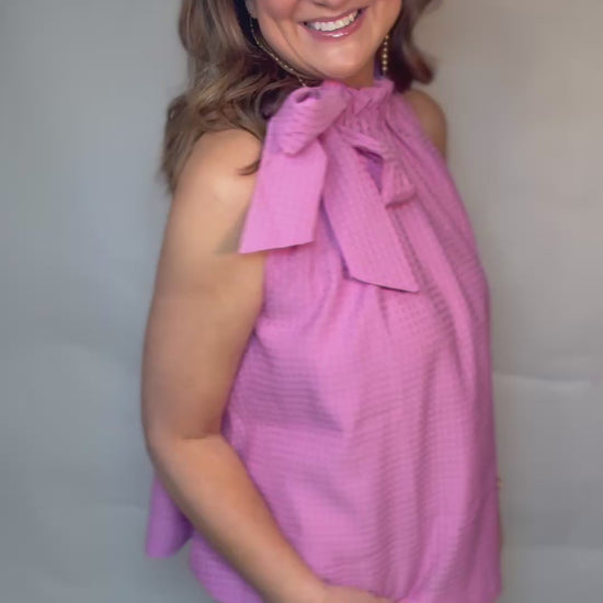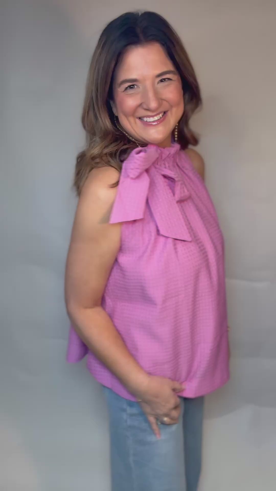 Make a statement with the sleeveless Pink bow swing top! This top is a bubble gum pink with a textured fabric that has a draw string functional bow tie at the neck! Dress up or down! It is slightly blousy under the arms. So, you may need a tank or bra-let of small chested.
