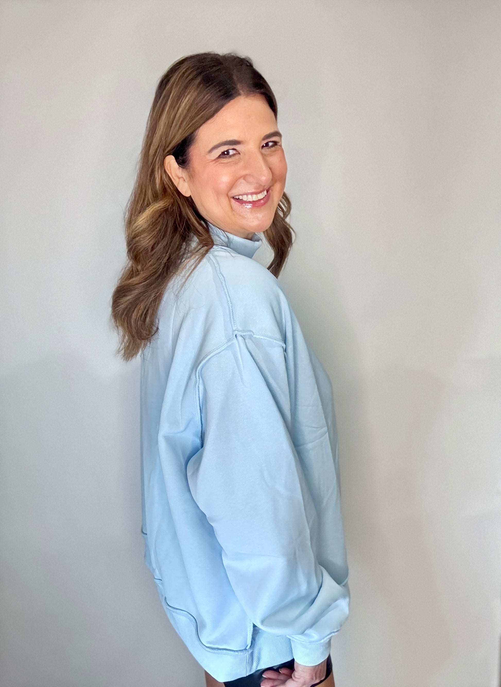 The Baby Blue Mock Neck Sweatshirt Is perfectly oversized comfy and will become your favorite!