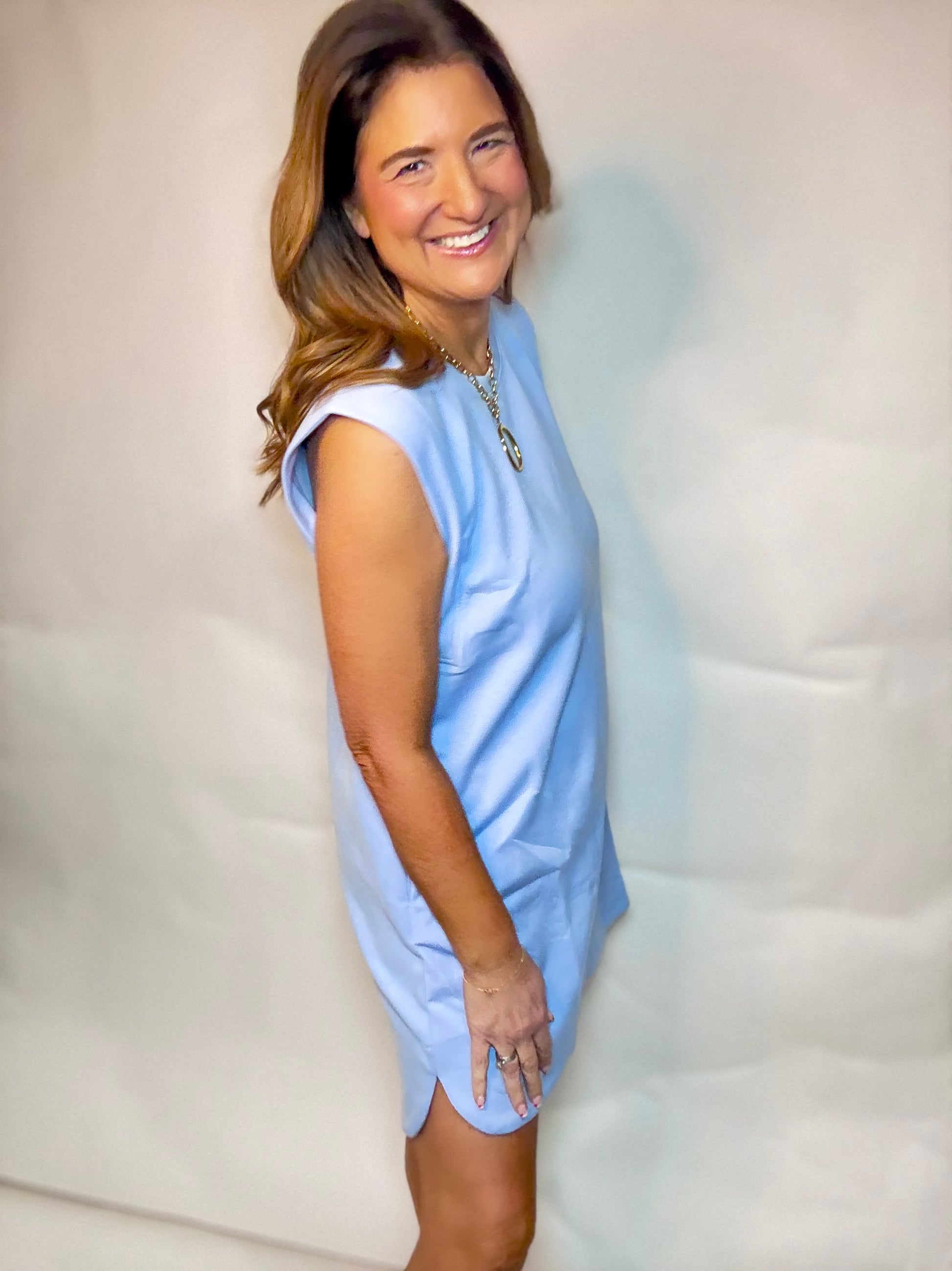 The Baby Blue Scuba Mini Dress. Soft, sleeveless, pockets, and super cute!!