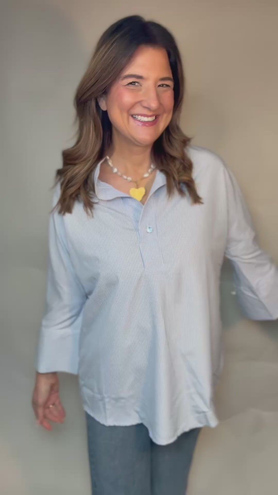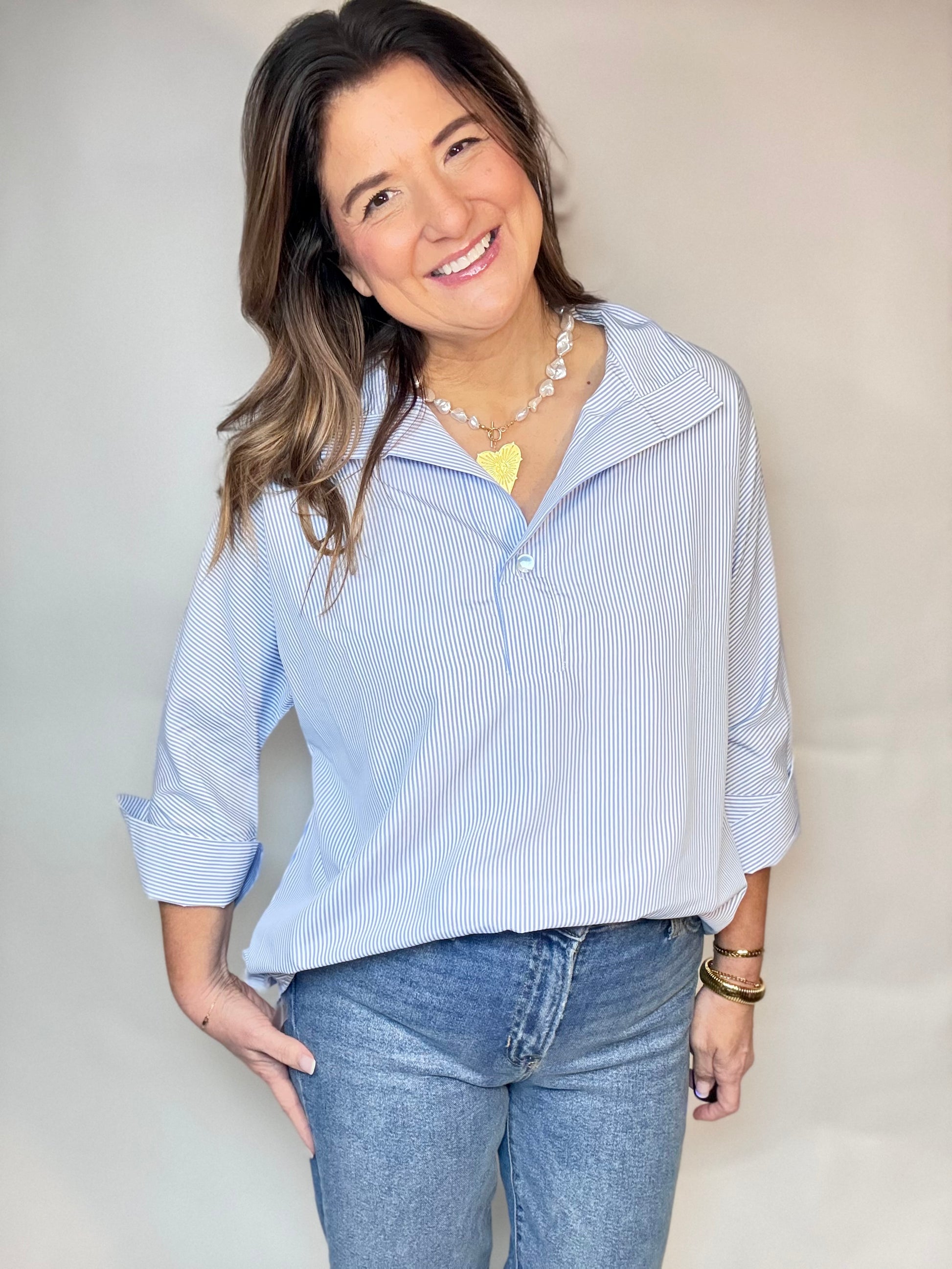 The sweetest blue stripe long quarter length sleeved blouse is here!! A pretty clean button on the front & sleeves. Dress up or down and you will love wearing this happy top!