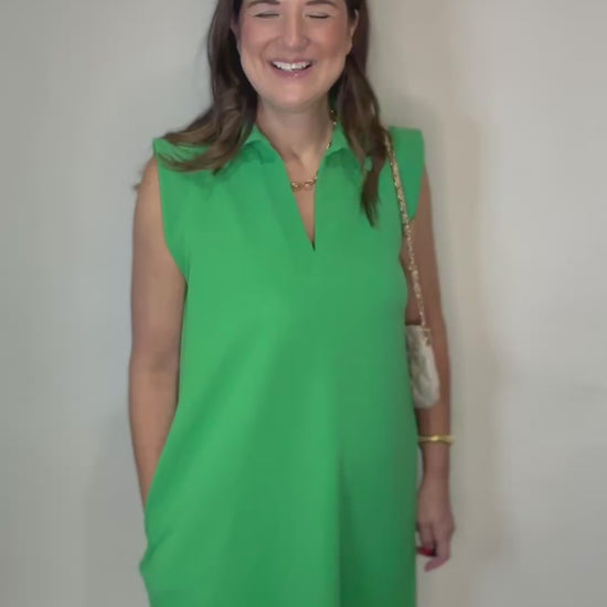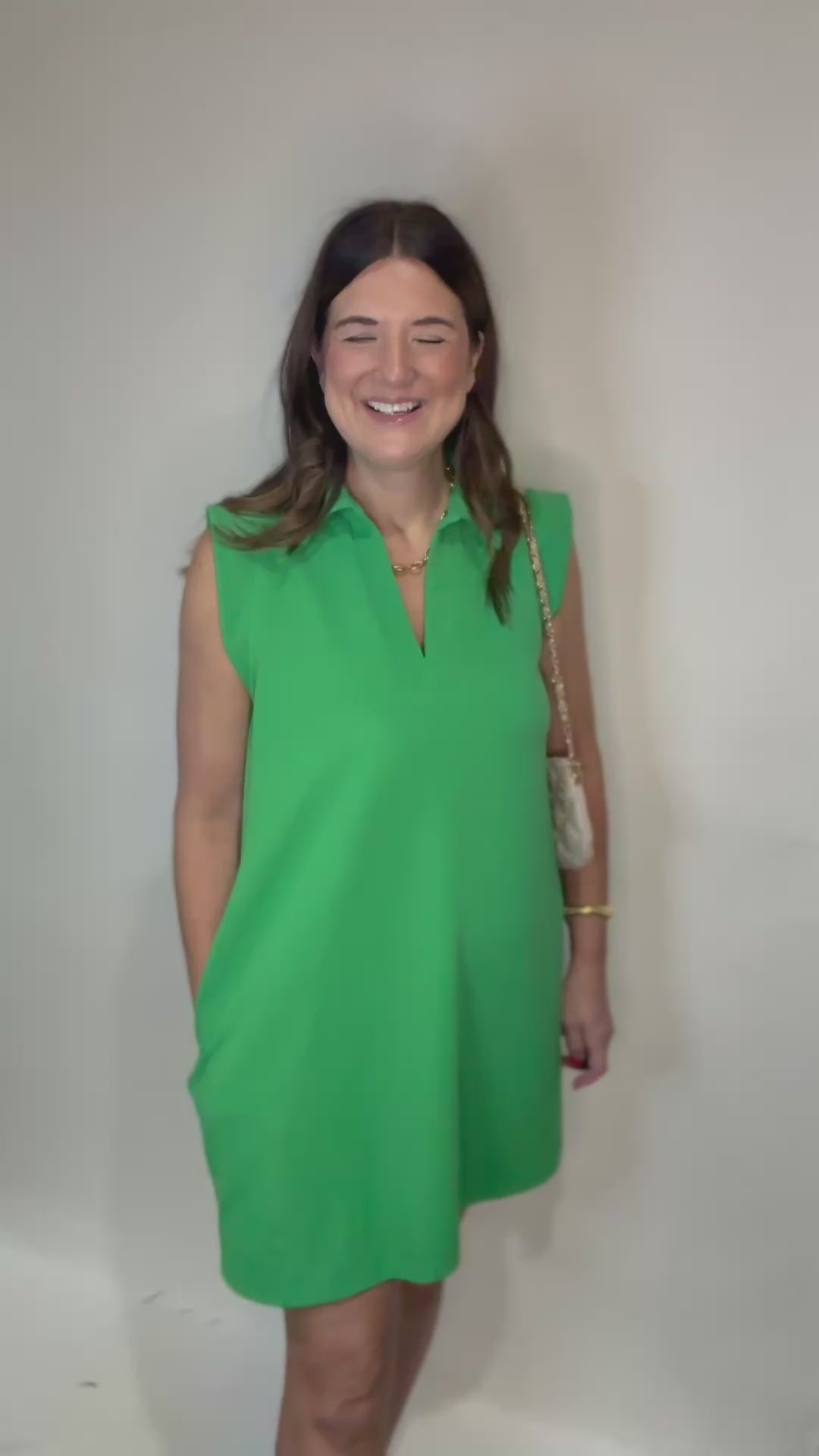 This little green dress will be your go to dress this year round in the south. . The dress is sleeveless, comfy, and has an adorable a-line flattering fit and looks good on everyone. Dress up or down. It has a cute collar at the neck. pockets, unlined knit, non-sheer and lightweight. It is 95% polyester and 5% spandex. This dress runs true to size. This dress also comes in navy blue.