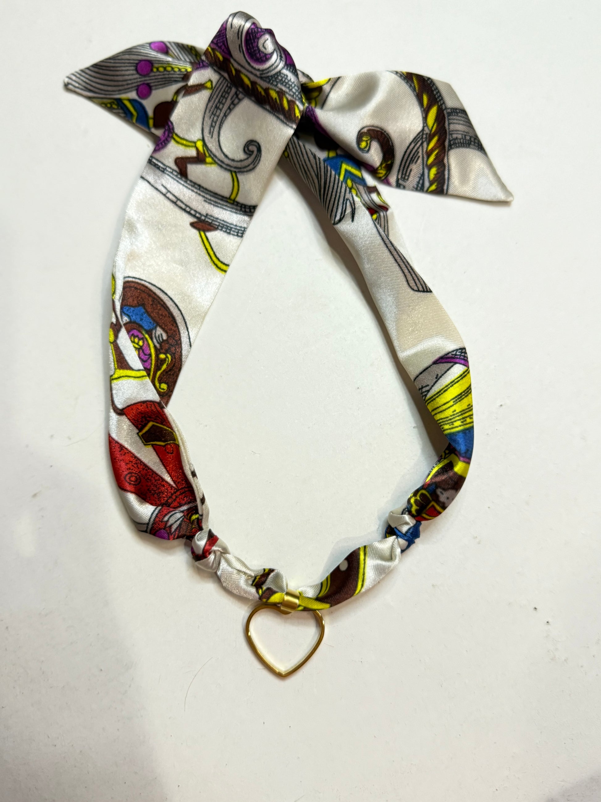 The cream, tan, blue, & yellow scarf necklace with gold plated heart