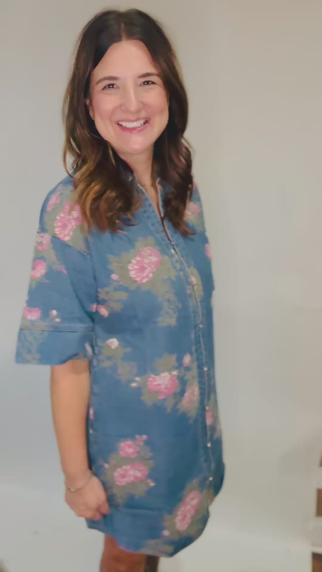 The cutest denim dress with a stunning floral print! A-line buttons up the front, collar, & gold buttons. Perfect for a country concert or a girls night out! Can size down if needed.