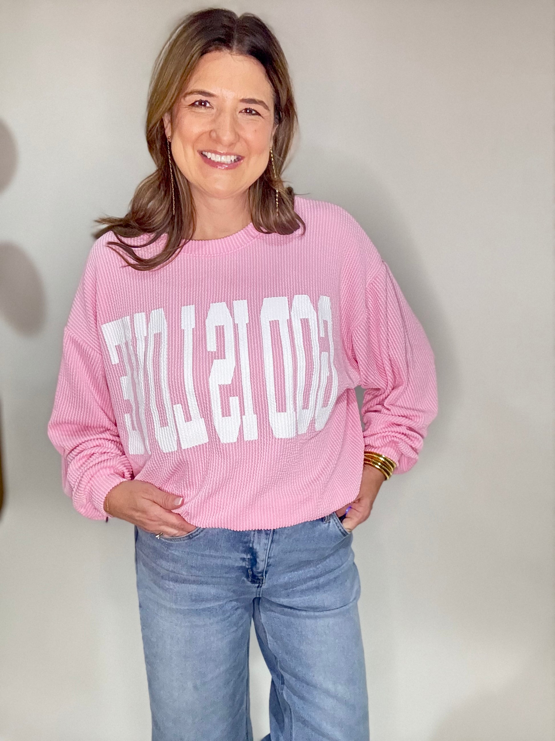 The God is Love Pink Sweatshirt! This sweatshirt is light weight and has an oversized fit.