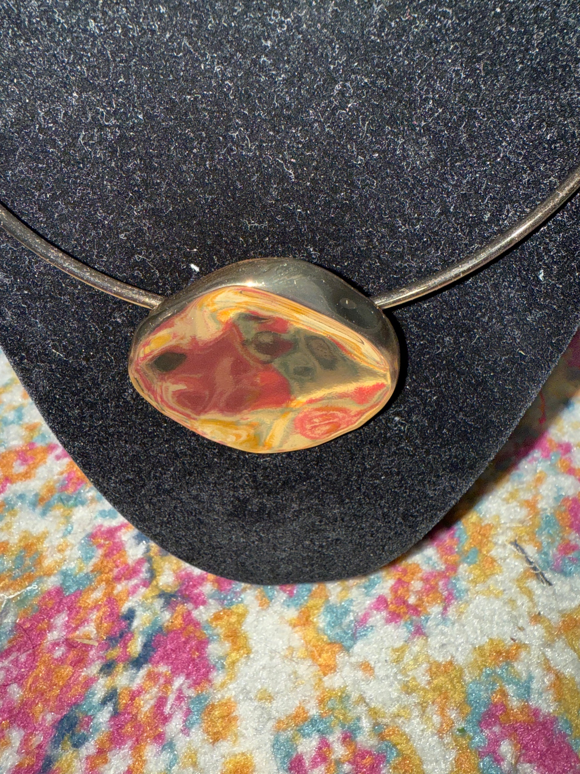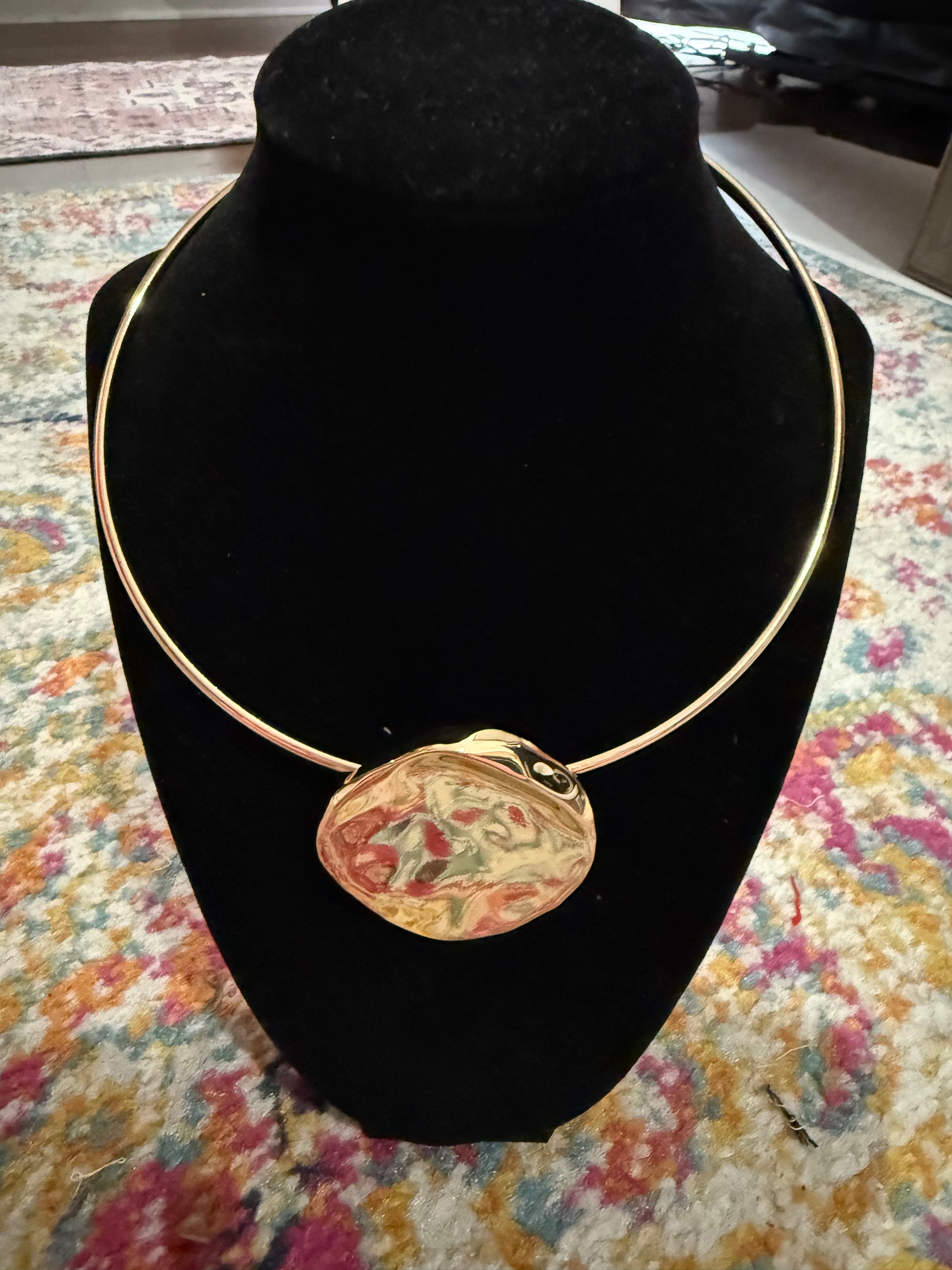 The Gold Circle Statement Necklace has a clasp in the back.Its a hard metal.