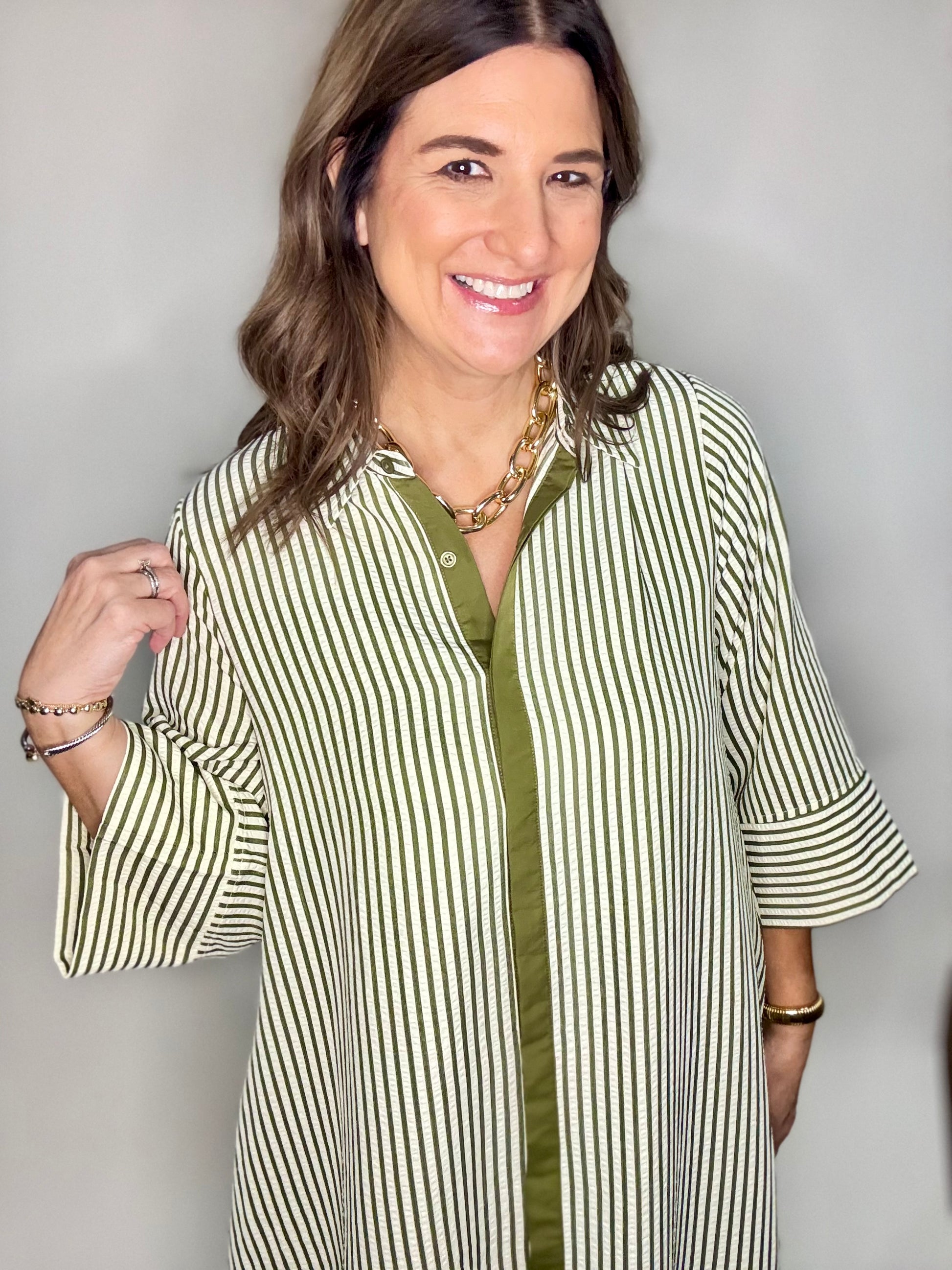 The green stripe maxi dress. Quarter sleeved, collar, buttons up the dress. Lined, pockets, & comfy