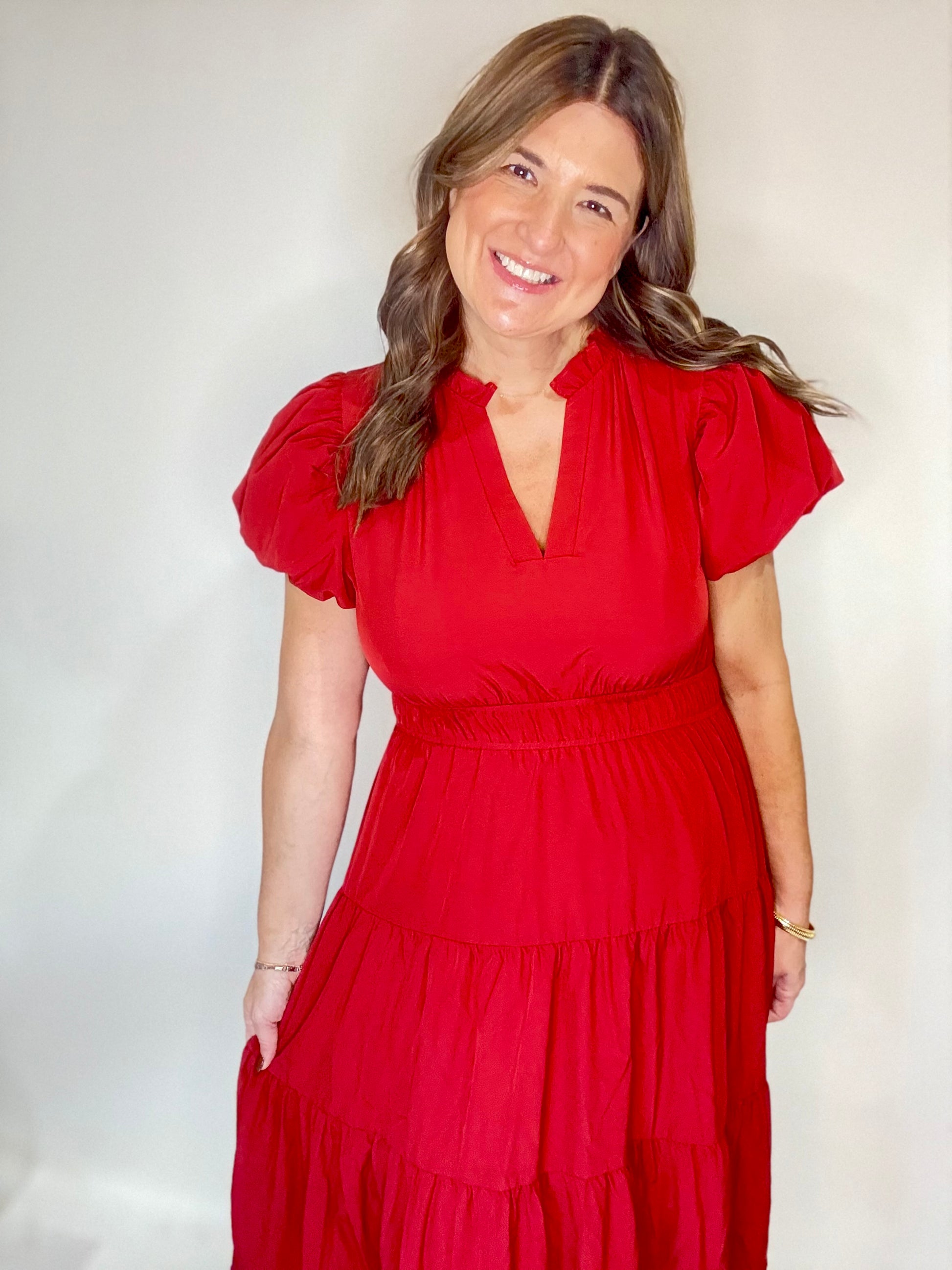 This Garnet Red Maxi Dress features a high neck, puff sleeves, and playful ruffles. This dress is perfect for the holidays, a party, family pictures, or church.