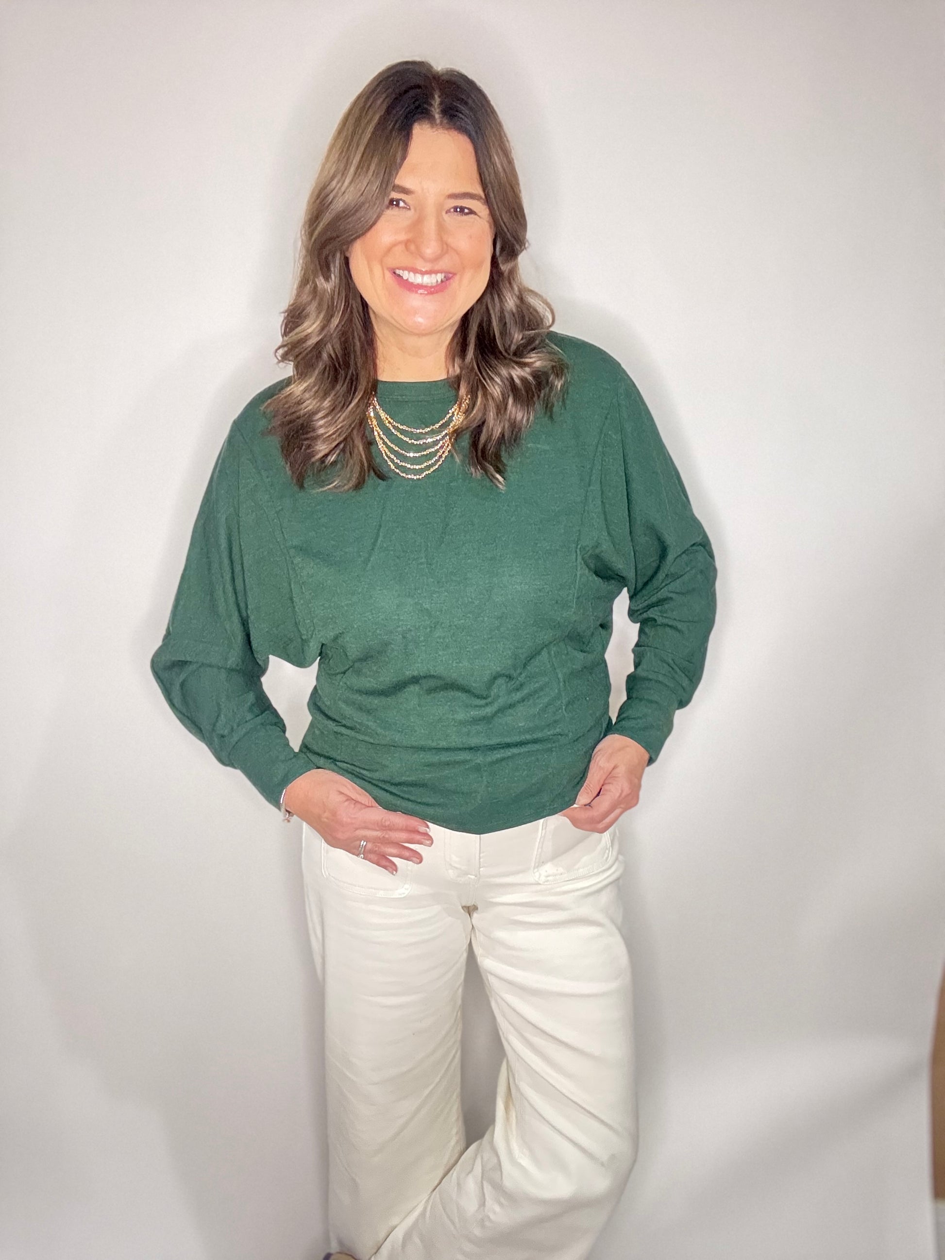 The Oversized Hunter Green Open Back Sweater is soft and comfy & has an open back.