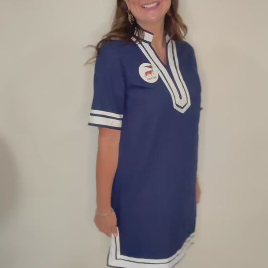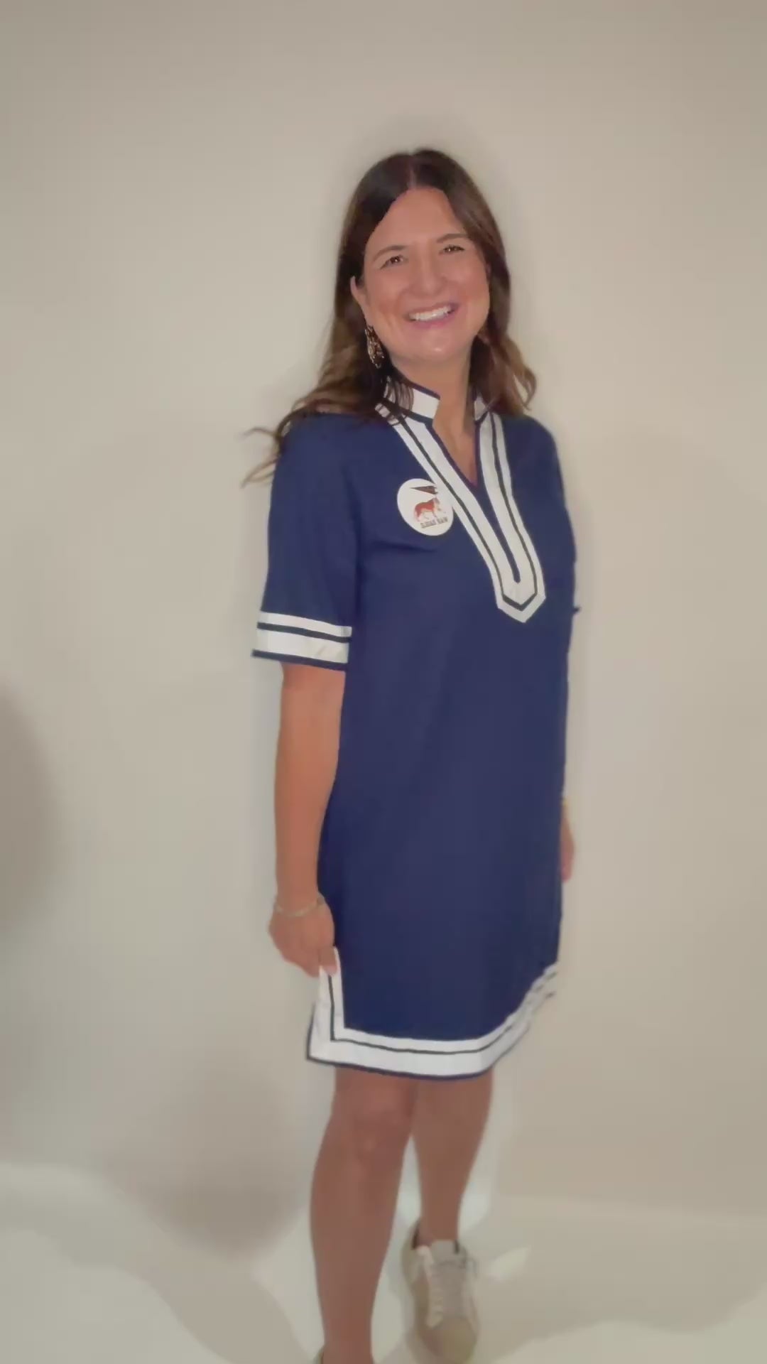 This is an adorable woven dress. It has a high neck, short sleeves, ribbon trim, a shift dress, and a side skirt bottom. There is no stretch, so get your normal size or size up if you want it to be looser.