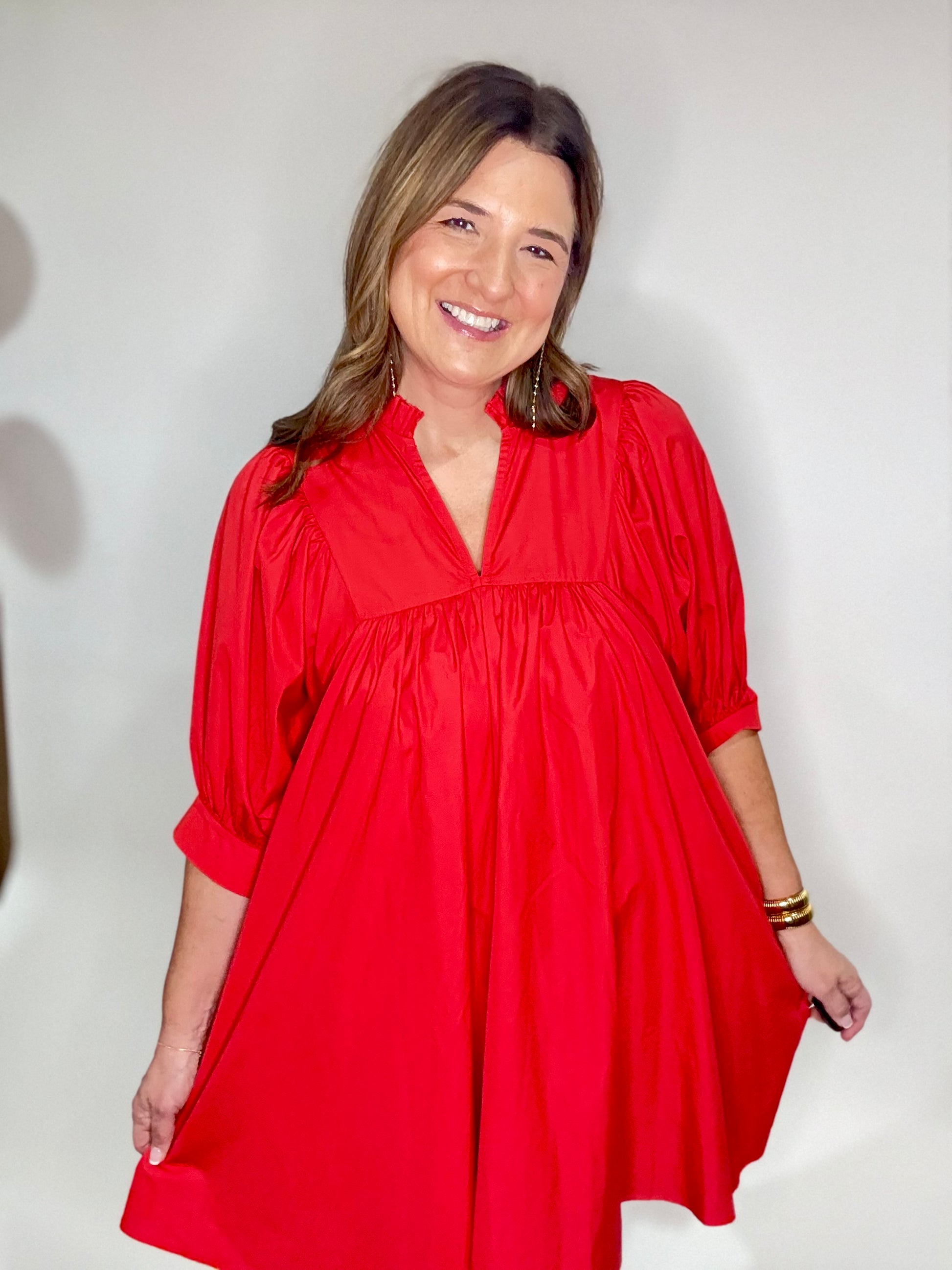 The red quarter sleeve dress is lined, quarter sleeve pockets, & perfect for the holidays
