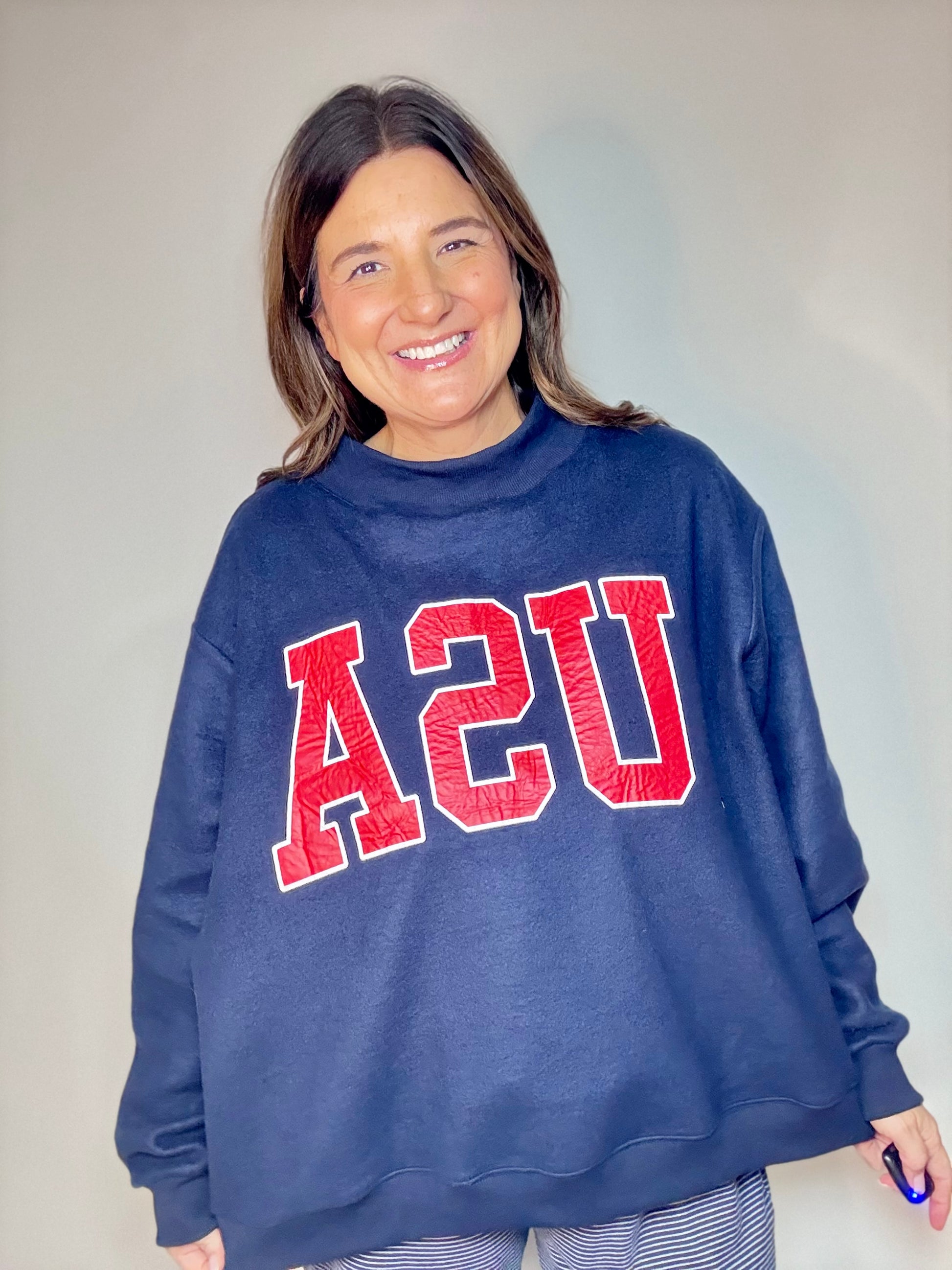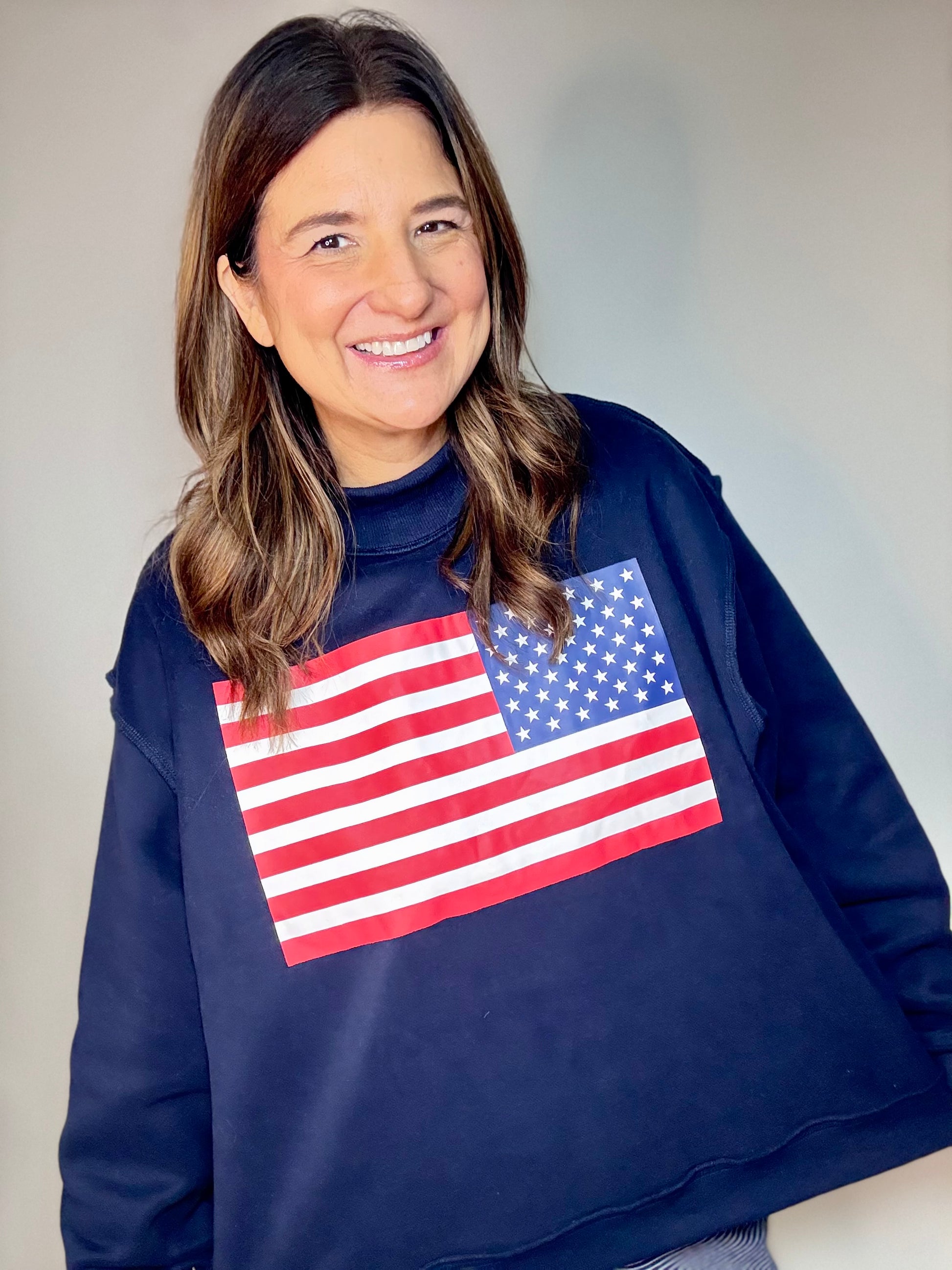 Meet your new favorite layer- A USA Reversible Navy Sweatshirt with a USA flag on one side or flipping it for the full “USA statement on the reverse, this two-in-one essential brings cozy versatility to your game day (or any day) wardrobe. Made from ultra-soft fleece with a relaxed, oversized fit and contrast ribbed trim, it's the perfect mix of comfort & cuteness. Style it with your favorite shorts, jeans, or leggings — Trust me you will love it!
